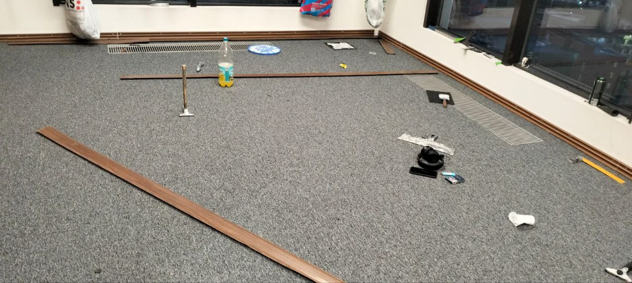 Обновили напольное покрытие в офисе компании площадью 1300 м². Две недели переговоров, подбора материалов и согласований. Зато теперь «опен-спейс» выделяется виниловой плиткой FineFloor, а кабинеты — ковровой плиткой Balsan Metropolitan Avenue.
